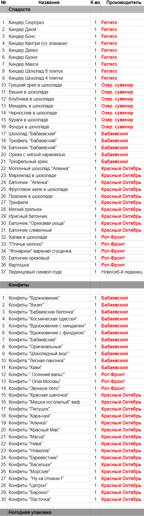 Жареный арахис с карамелью (1 шт), Молочный шоколад "Аленка" (1 шт), Мармелад в шоколаде (1 шт), Молочный батончик "Аленка" (1 шт), Фруктовое желе в шоколаде (1 шт), Трюфели (1 шт), Мягкий грильяж (1 шт), Ирисный батончик (1 шт), "Ореховая роща" (1 шт), Батончик сливочный (1 шт), Конфеты "Красная шапочка" (1 шт), Конфеты "Мишка косолапый" (1 шт), Конфеты "Петушок" (1 шт), Конфеты "Кара-кум" (1 шт), Конфеты "Аленка" (1 шт), Конфеты "Красный Мак" (1 шт), Конфеты "Маска" (1 шт), Конфеты "Нива" (1 шт), Конфеты "Киви" (1 шт), Конфеты "Буревестник" (1 шт), Конфеты "Васильки" (1 шт), Конфеты "Морские" (1 шт), Конфеты "Ну-ка отними!" (1 шт), Конфеты "Цитрон" (1 шт), Конфеты "Барокко" (1 шт), Конфеты "Ласточка" (1 шт), Конфеты "Мама приехала" (1 шт)